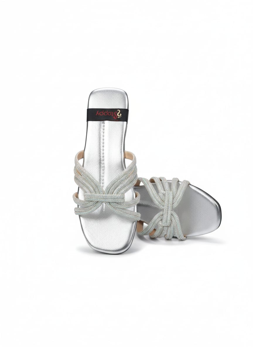 Ye metallic silver slides un khwateen ke liye behtareen hain jo effortless glamour pasand karti hain. Inka knot design aur textured finish inhein aik designer look deta hai.